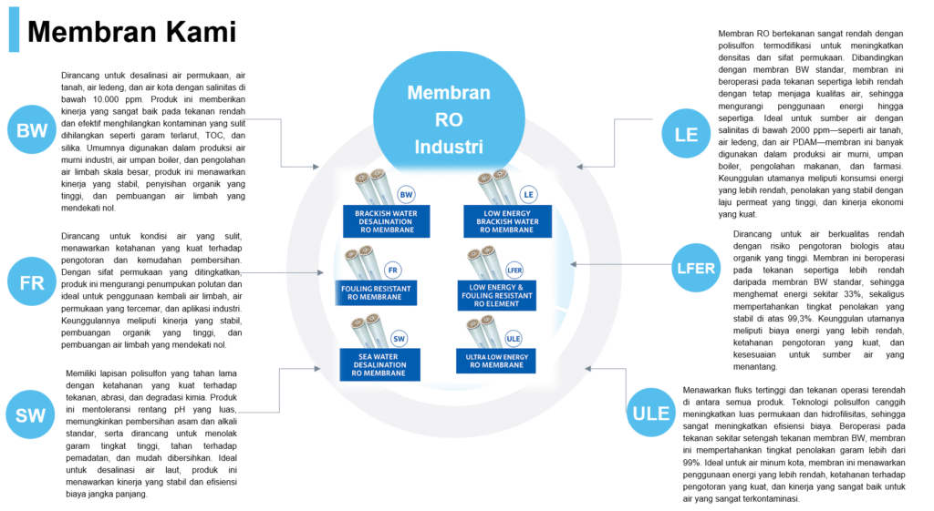 Terakhir, Reverse Osmosis (RO) dengan ukuran pori terkecil (0,0005–0,002 µm) dan tekanan tinggi (200–1200 psig) dapat menyaring hampir semua kontaminan, termasuk padatan tersuspensi, bakteri, virus, ion multivalen, dan bahkan ion monovalen. Hanya molekul air yang mampu melewati membran RO, sehingga menghasilkan tingkat kemurnian air tertinggi.